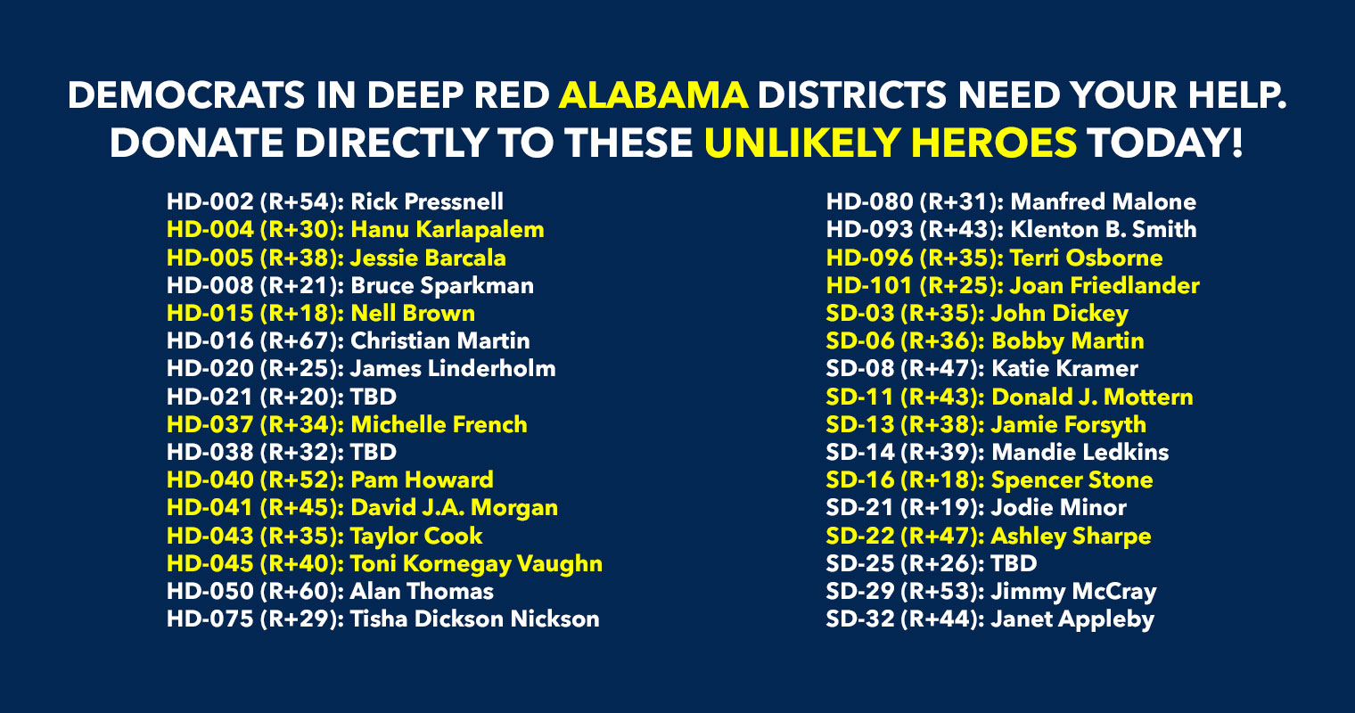 Donate to Democrats running in deep red districts to boost turnout & force Republicans to defend their turf!