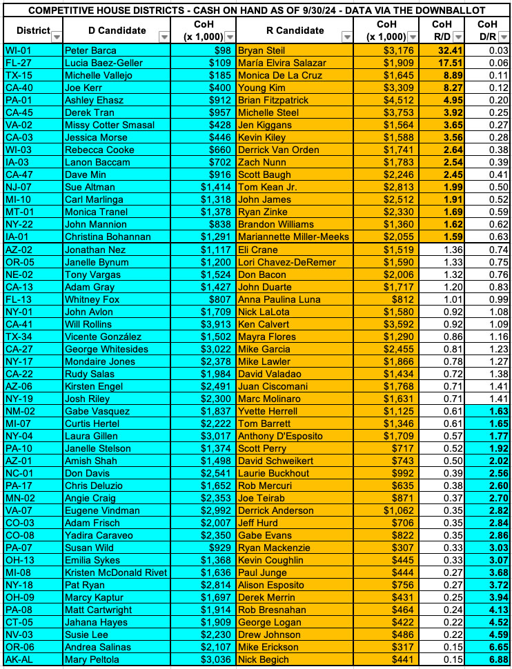 Inistead of looking at how much each candidate has raised, I'm looking purely at how much Cash On Hand they had as of the end of September, then comparing that against how much CoH their Republican opponent had.