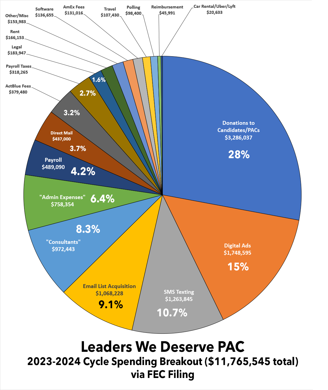 As you can see, they were first formed in June 2023 and raised a total of just over $11.9 million through the end of 2024. $9.6 million of that was via individual donations; the other $2.3 million was via "other receipts." I'm not worrying about where LWD's money comes from at this time; I'm willing to accept that it's all completely legitimate.