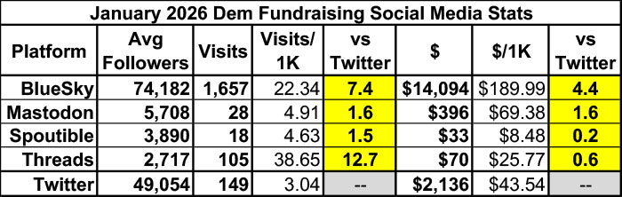 As for social media engagement, Bluesky generated 7.4x as much traffic and 4.4x as much in actual donations as Twitter on a per follower basis in January.